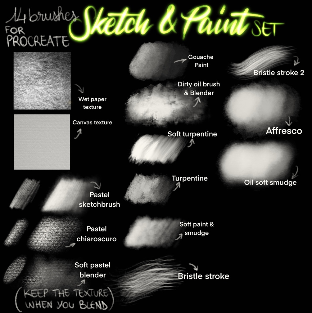 Hey everyone, Iโm back with this new Brushset! It comes with 14 brushes for Procrate (2 of them are my favorite textured background - canvas and wet paper), some pastel textured brushes and blender and some paint brushes!