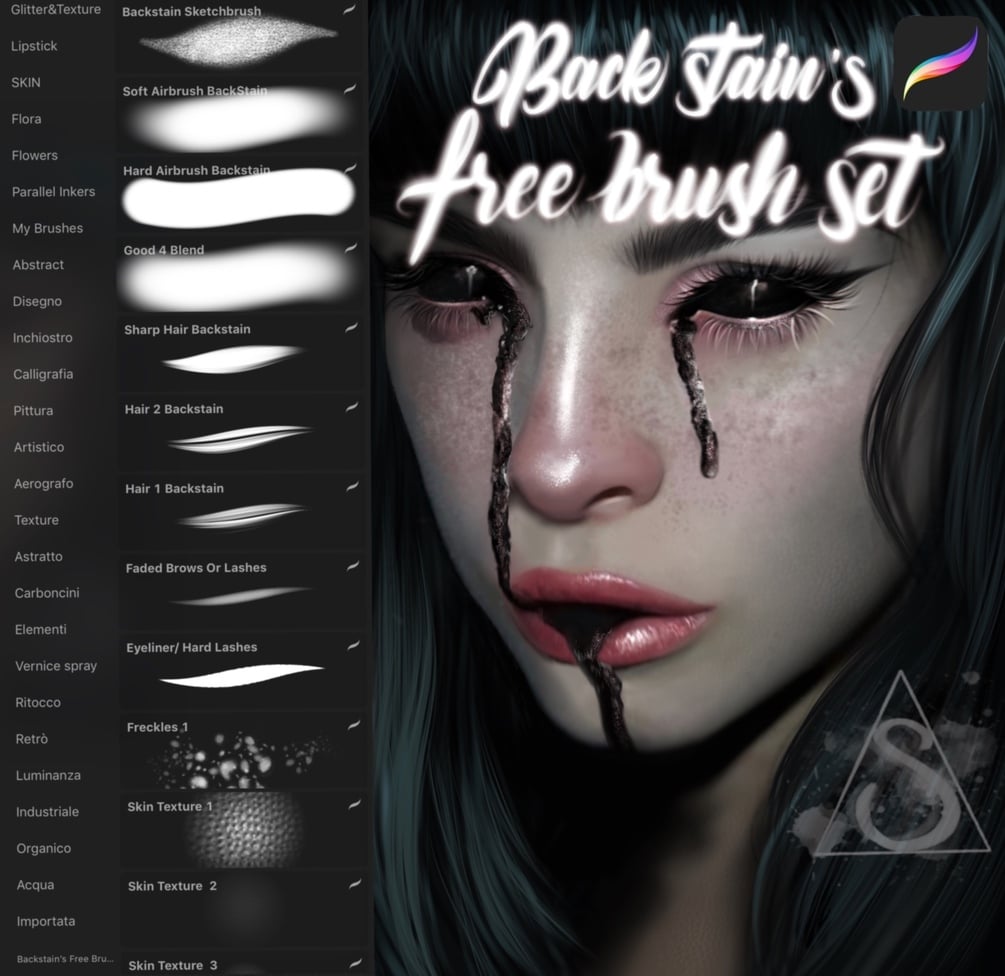 Hi everyone! This free brushset comes with 14 brushes: 1 sketchbrush, 2airbrushes, 1blender, 3hairbrushes, 2brushes good for brows or lashes, 3 skin textures, one for freckles and a glitter brush! Hope they’re helpful for all of you! Donations are really appreciated 🥺❤️